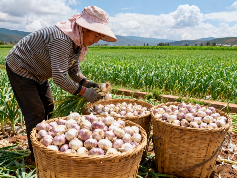 作为大理代表性的农产品之一,独头蒜凭借个头饱满、辛辣味浓、营养丰富的特点,深受市场青睐。今年,大理独头蒜种植面积稳定在 8 万亩,主要分布在弥渡、祥云、巍山等县,其中弥渡县作为核心产区,种植面积达 4.2 万亩,占全州总量的 52.5%。得益于适宜的土壤条件与科学的种植管理,今年独头蒜总产量达 6.4 万吨,同比增长 5%,因品质优良,收购价从去年的每公斤 12 元涨至 15.6 元,较普通大蒜高出 30%,核心产区弥渡县蒜农亩均收入突破 8000 元,较去年增加 1200 元。